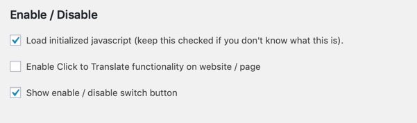 The next option Enable Click to Translate functionality on website / page enables our Click to Translate API by default if this option is checked. If this option is not checked your users will first have to click on our Click to Translate Button that is displayed on every blog.